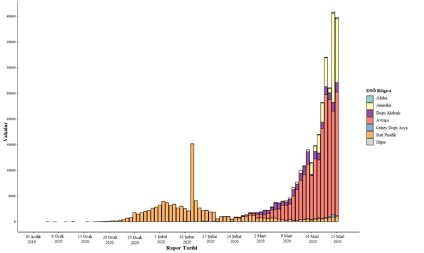 Şekil 2. 24 Mart 2020 tarihine kadar tam rapor günleriyle, doğrulanmış COVID-19 vakalarının, rapor tarihine ve DSÖ bölgesine göre epidemik eğrisi
