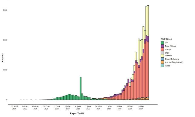 Şekil 2. 29 Mart 2020 tarihine kadar tam rapor günleriyle, doğrulanmış COVID-19 vakalarının, rapor tarihine ve DSÖ bölgesine göre epidemik eğrisi