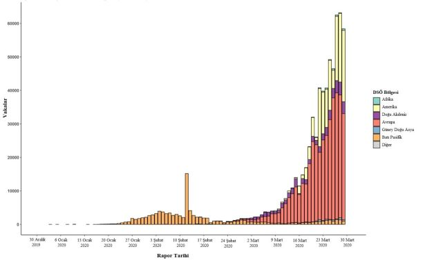 Şekil 2. 30 Mart 2020 tarihine kadar tam rapor günleriyle, doğrulanmış COVID-19 vakalarının, rapor tarihine ve DSÖ bölgesine göre epidemik eğrisi