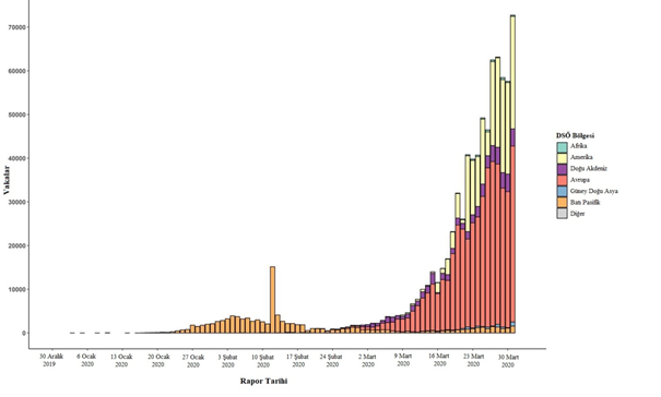 Şekil 1. 1 Nisan 2020 tarihine kadar tam rapor günleriyle, doğrulanmış COVID-19 vakalarının, rapor tarihine ve DSÖ bölgesine göre epidemik eğrisi