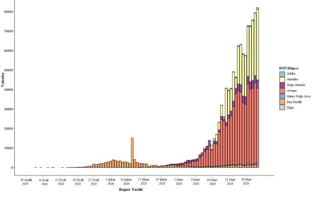 Şekil 1. 5 Nisan 2020 tarihine kadar tam rapor günleriyle, doğrulanmış COVID-19 vakalarının, rapor tarihine ve DSÖ bölgesine göre epidemik eğrisi