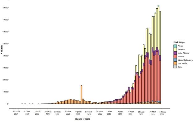Şekil 1. 6 Nisan 2020 tarihine kadar tam rapor günleriyle, doğrulanmış COVID-19 vakalarının, rapor tarihine ve DSÖ bölgesine göre epidemik eğrisi