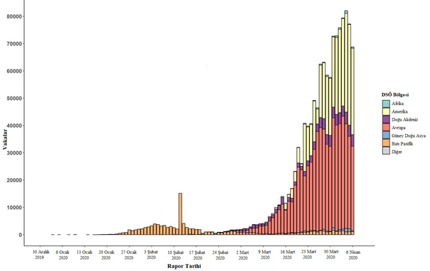 Şekil 1. 7 Nisan 2020 tarihine kadar tam rapor günleriyle, doğrulanmış COVID-19 vakalarının, rapor tarihine ve DSÖ bölgesine göre epidemik eğrisi