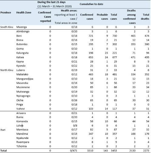 Demokratik Kongo Cumhuriyeti'nde 17 Şubat 2020'den bu yana, devam etmekte olan Ebola virüsü hastalığı (EVH) salgınında yeni vaka bildirilmemiştir. 1 ila 7 Nisan arasında, günlük ortalama 2.208 uyarı bildirilmiş ve araştırılmış olup bu sayı önceki iki haftada etkilenen sağlık bölgelerinde bildirilen uyarıların sayısından %50 daha azdır.
