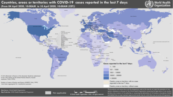 Şekil 1. Doğrulanmış COVID-19 vakalarının bildirildiği ülkeler, yönetim bölgeleri veya bölgeler, 10 Nisan 2020