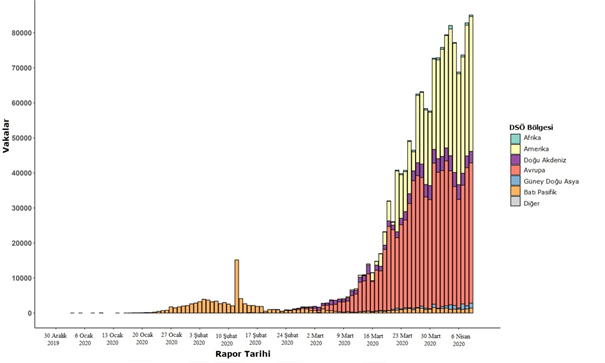 Şekil 1. 10 Nisan 2020 tarihine kadar tam rapor günleriyle, doğrulanmış COVID-19 vakalarının, rapor tarihine ve DSÖ bölgesine göre epidemik eğrisi