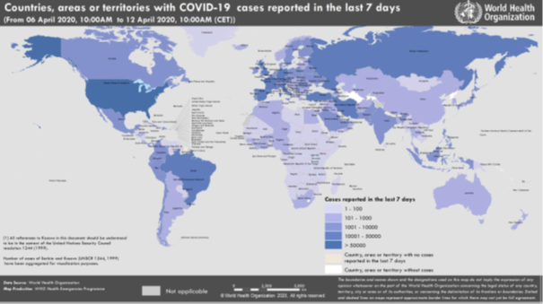 Şekil 1. Doğrulanmış COVID-19 vakalarının bildirildiği ülkeler, yönetim bölgeleri veya bölgeler, 12 Nisan 2020
