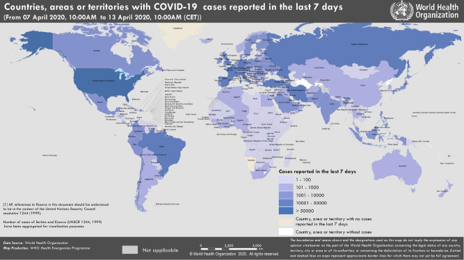 Şekil 1. Doğrulanmış COVID-19 vakalarının bildirildiği ülkeler, yönetim bölgeleri veya bölgeler, 13 Nisan 2020