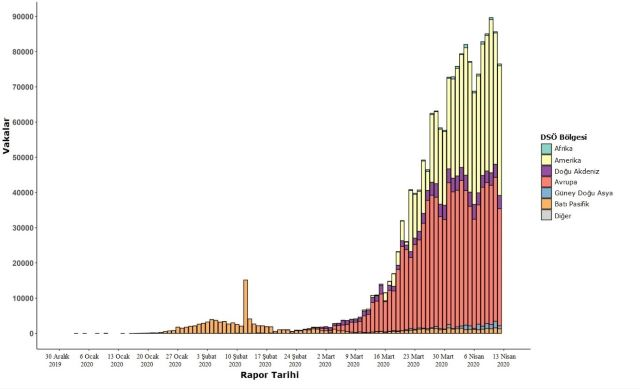 Şekil 1. 13 Nisan 2020 tarihine kadar tam rapor günleriyle, doğrulanmış COVID-19 vakalarının, rapor tarihine ve DSÖ bölgesine göre epidemik eğrisi
