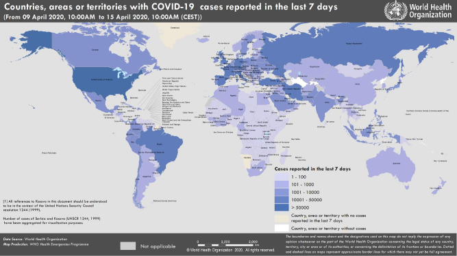 Şekil 1. Doğrulanmış COVID-19 vakalarının bildirildiği ülkeler, yönetim bölgeleri veya bölgeler, 15 Nisan 2020