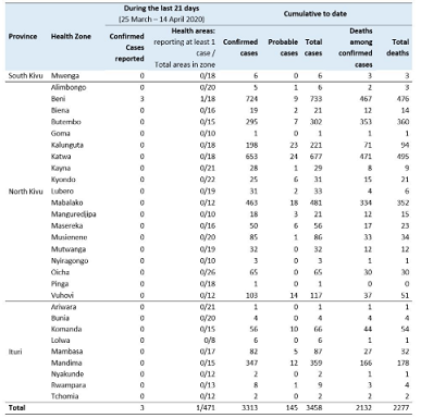 Tablo 1: 14 Nisan 2020 'de Demokratik Kongo Cumhuriyeti'nin Kuzey Kivu ve Ituri illerinde sağlık bölgelerine göre hastalıktan etkilenen sağlık alanları ve doğrulanmış ve olası Ebola virüsü hastalığı vakaları