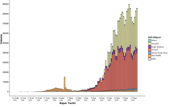 Şekil 4. 18 Nisan 2020 tarihine kadar tam rapor günleriyle, doğrulanmış COVID-19 vakalarının, rapor tarihine ve DSÖ bölgesine göre epidemik eğrisi