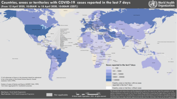 Şekil 1. Doğrulanmış COVID-19 vakalarının bildirildiği ülkeler, yönetim bölgeleri veya bölgeler, 18 Nisan 2020
