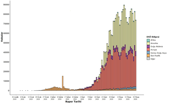 Şekil 4. 22 Nisan 2020 tarihine kadar tam rapor günleriyle, doğrulanmış COVID-19 vakalarının, rapor tarihine ve DSÖ bölgesine göre epidemik eğrisi