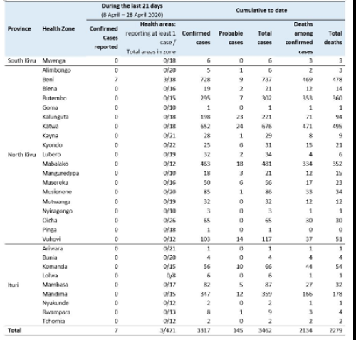 22-28 Nisan 2020 tarihleri arasında Demokratik Kongo Cumhuriyeti'nin, Kuzey Kivu Eyaletindeki Beni Sağlık Bölgesi'nden doğrulanmış 1 yeni Ebola virüsü hastalığı vakası rapor edilmiştir. Salgının 10 Nisan 2020'de yeniden canlanmasından bu yana, hepsi Beni Sağlık Bölgesi'nden doğrulanmış 7 vaka bildirilmiştir.