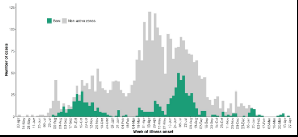 Salgının 10 Nisan 2020'de yeniden canlanmasından bu yana, hepsi Beni Sağlık Bölgesi'nden doğrulanmış 7 vaka bildirilmiştir. Bu vakalardan biri, Beni Ebola Tedavi Merkezinde (ETM) sağlık hizmeti almakta, biri ETM'de sağlık hizmeti almış ve taburcu edilmiş olan ve biri ise toplum içinde bulunmaktadır. Yanıt ekipleri bu kişiyi tedaviye ve destekleyici bakıma erişim ve toplulukta daha fazla bulaşmayı önlemek için ETM'ye getirmek üzere toplulukla yakından ilgilenmektedirler. Beni'de, ETM'de 2 ölüm ve toplumda 2 ölüm de dahil olmak üzere 4 kişinin Ebola'dan öldüğü doğrulanmıştır.