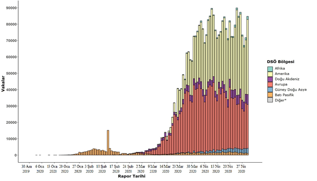 Şekil 2. Rapor tarihi ve DSÖ bölgesine göre doğrulanmış COVID-19 vakalarının sayısı, 30 Aralık 2019 - 1 Mayıs 2020*