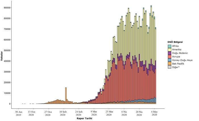 Şekil 2. Rapor tarihi ve DSÖ bölgesine göre doğrulanmış COVID-19 vakalarının sayısı, 30 Aralık 2019 - 6 Mayıs 2020*
