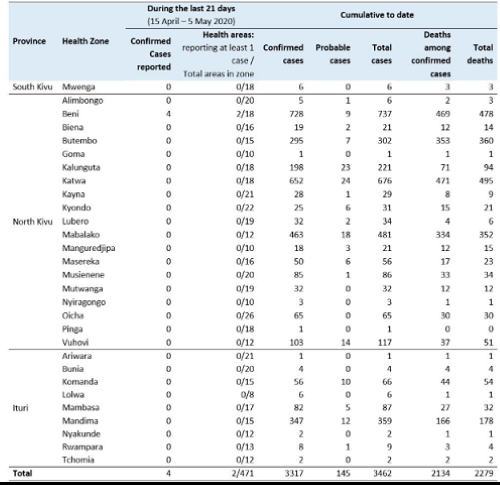 Tablo 1: 5 Mayıs 2020 'de Demokratik Kongo Cumhuriyeti'nin Kuzey Kivu ve Ituri illerinde sağlık bölgelerine göre hastalıktan etkilenen sağlık alanları ve doğrulanmış ve olası Ebola virüsü hastalığı vakaları