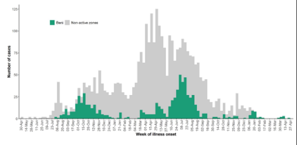 Şekil 1: 5 Mayıs 2020 tarihi itibariyle hastalık başlangıcı haftası ve sağlık bölgesine göre doğrulanmış ve olası Ebola virüsü hastalığı vakalarıyla ilgili veriler
