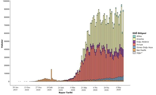Şekil 2. Rapor tarihi ve DSÖ bölgesine göre doğrulanmış COVID-19 vakalarının sayısı, 30 Aralık 2019 - 11 Mayıs 2020**