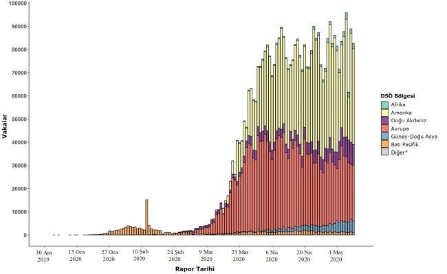 Şekil 2. Rapor tarihi ve DSÖ bölgesine göre doğrulanmış COVID-19 vakalarının sayısı, 30 Aralık 2019 - 12 Mayıs 2020**