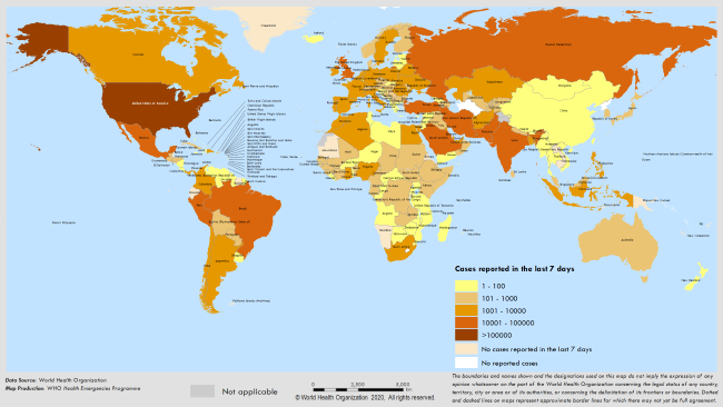 Sayımlar, aksi belirtilmedikçe DSÖ vaka tanımlarına (https://www.who.int/publications-detail/global-surveillance-for-human-infection-with-novel-coronavirus-(2019-ncov) ) dayanarak laboratuvar tarafından onaylanan vakaları ve ölümleri yansıtmakta (bkz. Ülkeye veya bölgeye özgü güncellemeler ve yazım hataları) ve hem ülke içindeki, hem de ülkesine geri gönderilen vakaları içermektedir.