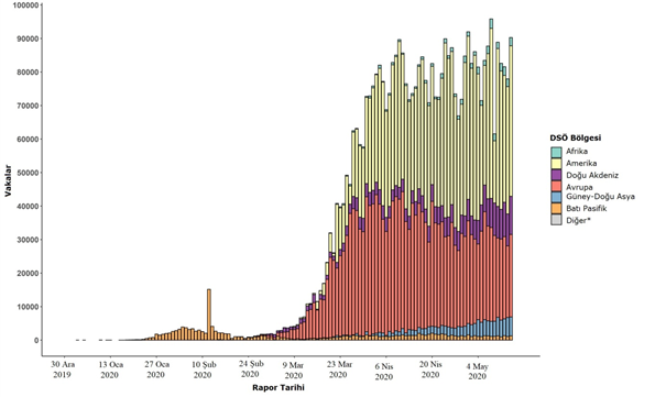 Şekil 2. Rapor tarihi ve DSÖ bölgesine göre doğrulanmış COVID-19 vakalarının sayısı, 30 Aralık 2019 - 15 Mayıs 2020**