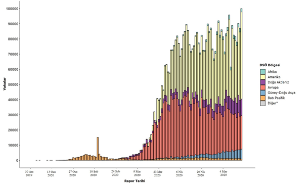 Şekil 2. Rapor tarihi ve DSÖ bölgesine göre doğrulanmış COVID-19 vakalarının sayısı, 30 Aralık 2019 - 17 Mayıs 2020**