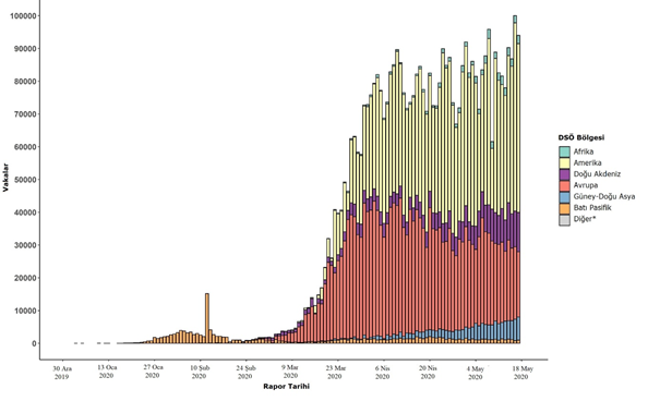 Şekil 2. Rapor tarihi ve DSÖ bölgesine göre doğrulanmış COVID-19 vakalarının sayısı, 30 Aralık 2019 - 18 Mayıs 2020**