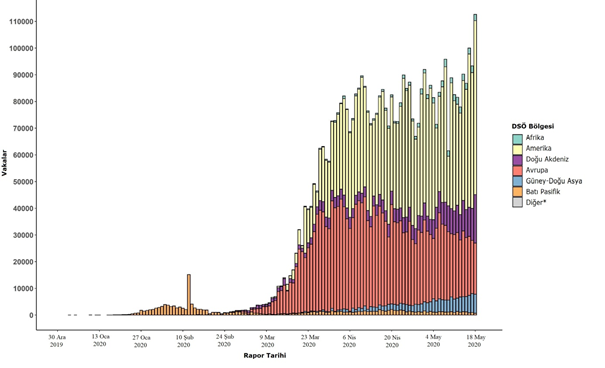 Şekil 2. Rapor tarihi ve DSÖ bölgesine göre doğrulanmış COVID-19 vakalarının sayısı, 30 Aralık 2019 - 19 Mayıs 2020**