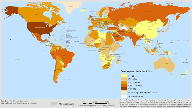 Sayımlar, aksi belirtilmedikçe DSÖ vaka tanımlarına (https://www.who.int/publications-detail/global-surveillance-for-human-infection-with-novel-coronavirus-(2019-ncov) ) dayanarak laboratuvar tarafından onaylanan vakaları ve ölümleri yansıtmakta (bkz. Ülkeye veya bölgeye özgü güncellemeler ve yazım hataları) ve hem ülke içindeki, hem de ülkesine geri gönderilen vakaları içermektedir.