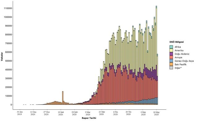 Şekil 2. Rapor tarihi ve DSÖ bölgesine göre doğrulanmış COVID-19 vakalarının sayısı, 30 Aralık 2019 - 20 Mayıs 2020**