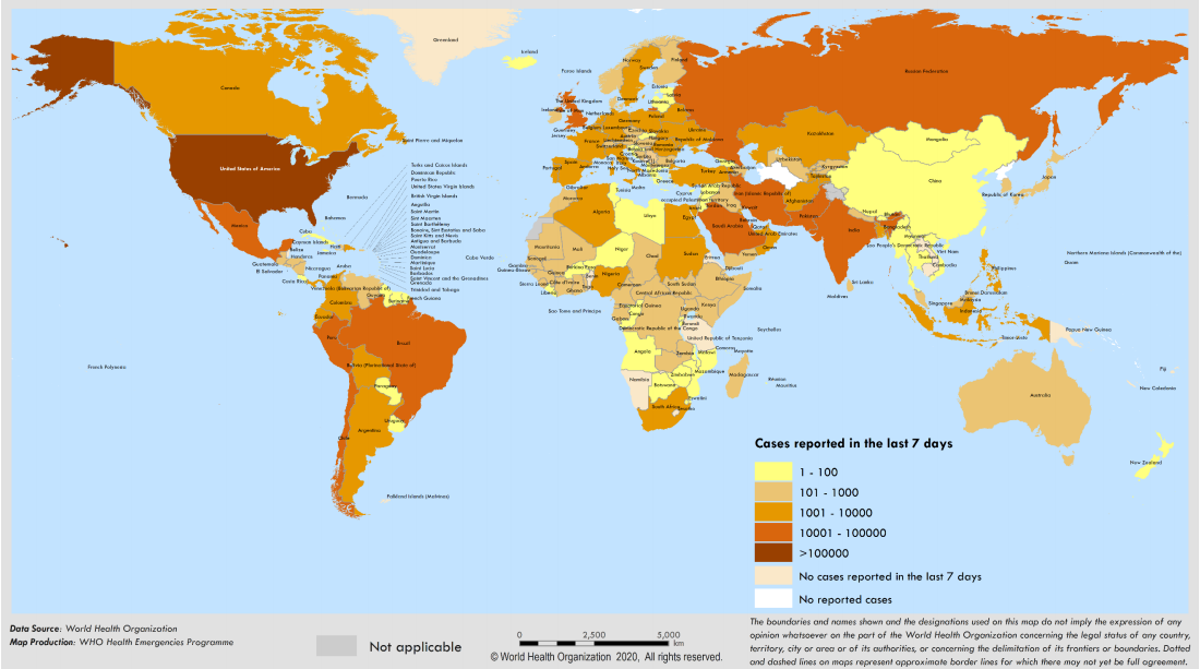 Şekil 1. Son yedi gün içinde, ülke veya bölgeye göre bildirilen doğrulanmış COVID-19 vakası sayısı, 15 - 21 Mayıs**