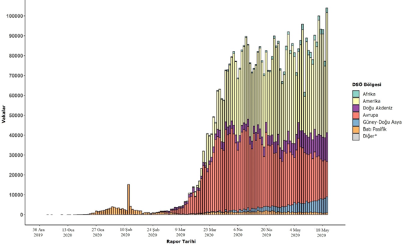 Şekil 2. Rapor tarihi ve DSÖ bölgesine göre doğrulanmış COVID-19 vakalarının sayısı, 30 Aralık 2019 - 21 Mayıs 2020**