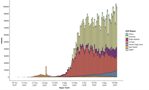 Şekil 2. Rapor tarihi ve DSÖ bölgesine göre doğrulanmış COVID-19 vakalarının sayısı, 30 Aralık 2019 - 22 Mayıs 2020**