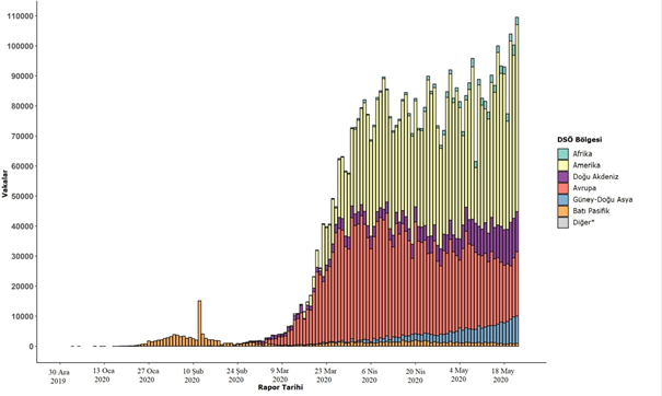 Şekil 2. Rapor tarihi ve DSÖ bölgesine göre doğrulanmış COVID-19 vakalarının sayısı, 30 Aralık 2019 - 23 Mayıs 2020**