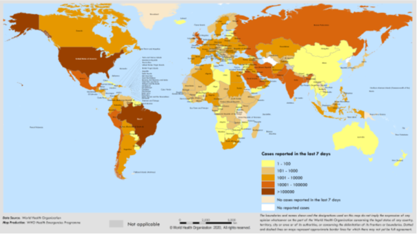 Şekil 1. Son yedi gün içinde, ülke veya bölgeye göre bildirilen doğrulanmış COVID-19 vakası sayısı, 18 - 24 Mayıs**