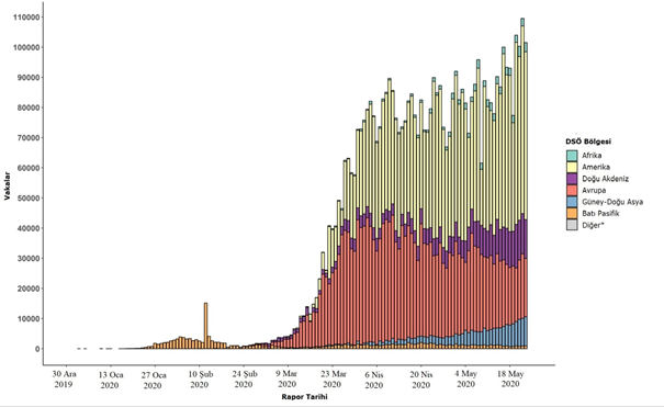 Şekil 2. Rapor tarihi ve DSÖ bölgesine göre doğrulanmış COVID-19 vakalarının sayısı, 30 Aralık 2019 - 24 Mayıs 2020**