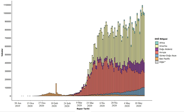 Şekil 2. Rapor tarihi ve DSÖ bölgesine göre doğrulanmış COVID-19 vakalarının sayısı, 30 Aralık 2019 - 25 Mayıs 2020**