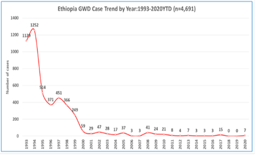 Şekil 1. 1993'ten 2020'ye kadar Gine solucanı hastalığı (GWD) vaka eğilimi *