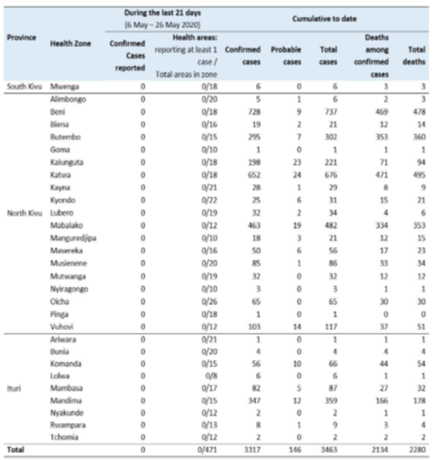 22 Mayıs'ta, Mabalako ve Lubero Sağlık Bölgelerinde bildirilen, semptom başlangıçları Mart 2019 ve Temmuz 2019 olan, geçmişe dönük 2 olası vaka, doğrulanmıştır. 26 Mayıs 2020 itibariyle, 3.317'si doğrulanmış ve 146'sı olası olmak üzere toplam 3.463 EVH vakası bildirilmiştir. Bunlardan 2.280'i ölmüştür (genel vaka ölüm oranı % 66) ve 1.171'i hayatta kalmıştır. Toplam doğrulanmış ve olası vakaların % 57'si (n = 1.970) kadın,% 29'u (n = 1.002) 18 yaşından küçük çocuklar ve % 5'i (n = 171) sağlık çalışanıdır.