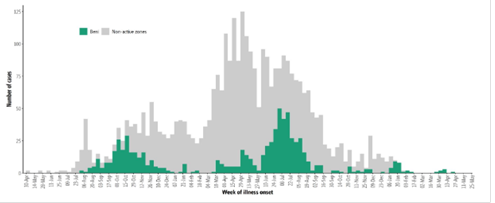 Şekil 1: 26 Mayıs 2020 tarihi itibariyle hastalık başlangıcı haftası ve sağlık bölgesine göre doğrulanmış ve olası Ebola virüsü hastalığı vakalarıyla ilgili veriler