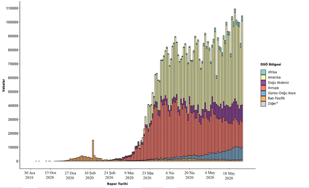 Şekil 2. Rapor tarihi ve DSÖ bölgesine göre doğrulanmış COVID-19 vakalarının sayısı, 30 Aralık 2019 - 28 Mayıs 2020**