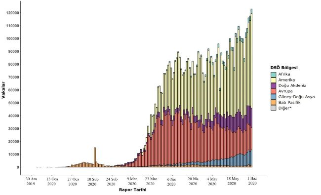 Şekil 2. Rapor tarihi ve DSÖ bölgesine göre doğrulanmış COVID-19 vakalarının sayısı, 30 Aralık 2019 – 1 Haziran 2020**
