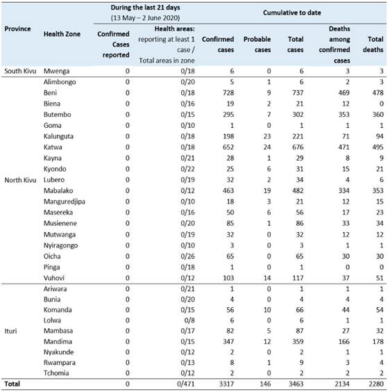 27 Nisan 2020'den bu yana Demokratik Kongo Cumhuriyeti'nin Ituri, Kuzey Kivu ve Güney Kivu İllerinde doğrulanmış yeni bir Ebola virüsü hastalığı (EVH) vakası bildirilmemiştir. 2 Haziran 2020 itibariyle, 3.317'si doğrulanmış ve 146'sı olası olmak üzere toplam 3.463 EVH vakası bildirilmiştir. Bunlardan 2.280'i ölmüştür (genel vaka ölüm oranı % 66) ve 1.171'i hayatta kalmıştır