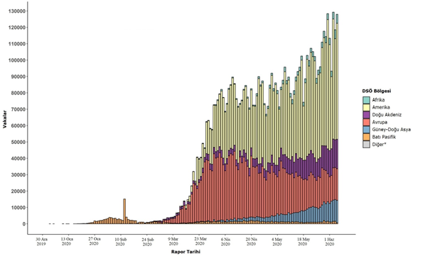 Şekil 2. Rapor tarihi ve DSÖ bölgesine göre doğrulanmış COVID-19 vakalarının sayısı, 30 Aralık 2019 – 6 Haziran 2020**