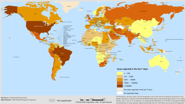 Şekil 1. Son yedi gün içinde, ülke veya bölgeye göre bildirilen doğrulanmış COVID-19 vakası sayısı, 1– 6 Haziran **