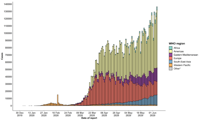 Şekil 2. Rapor tarihi ve DSÖ bölgesine göre doğrulanmış COVID-19 vakalarının sayısı, 30 Aralık 2019 – 7 Haziran 2020**
