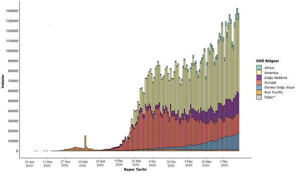 Şekil 2. Rapor tarihi ve DSÖ bölgesine göre doğrulanmış COVID-19 vakalarının sayısı, 30 Aralık 2019 – 14 Haziran 2020**